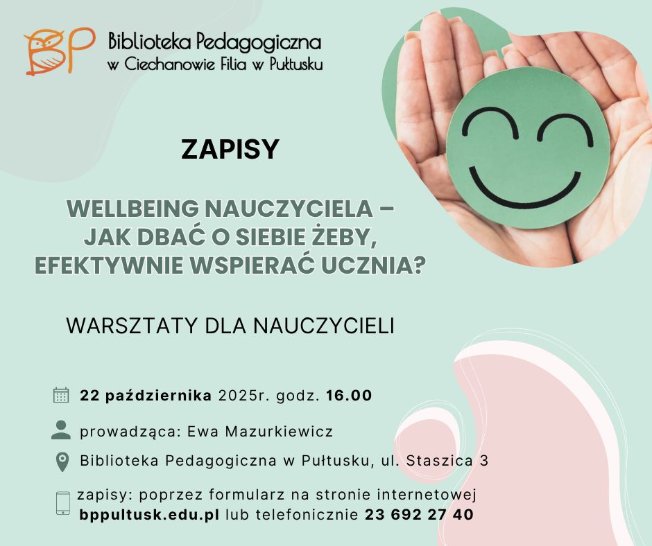 Warsztaty odbędą się 22 października 2025 r. o godz. 16:00 w siedzibie Biblioteki Pedagogicznej, przy ul Staszica 3 w Pułtusku.