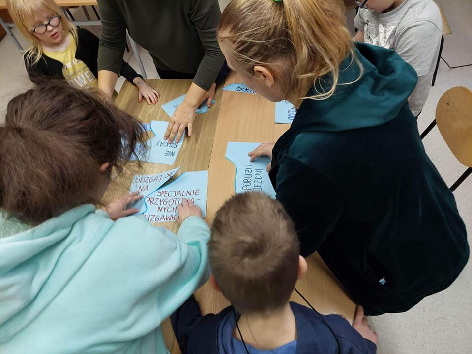 Kolejnym punktem spotkania były zadania tematyczne: układanie haseł z „Pękającej kry lodowej”, klasyfikowanie planszy edukacyjnej według zasady „Bezpieczne – niebezpieczne zabawy zimowe” z naciskiem na przestrzeganie bezpieczeństwa, układanie zdań z rozsypanki wyrazowej i tworzenie kodeksu „Bezpieczny zimowy wypoczynek”, prezentowanie scenek sytuacyjnych oraz wykonanie gazetki informacyjno-edukacyjnej.