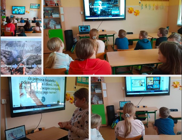 z Internetu. Wprowadzeniem do tematu zajęć był film edukacyjny pt. „Bezpieczne zachowania”. Następnie rozmowa na temat filmu i spora dawka przypominających informacji pozwoliła uczestnikom rozpocząć zmagania z wojownikami tajemnej misji czyli escape room – pokój zagadek stworzony przez Dorotę Karkowską nauczyciela bibliotekarza w programie genially. Ta podróż po zakątkach internetu bardzo zainteresowała uczestników https://tiny.pl/w44mx