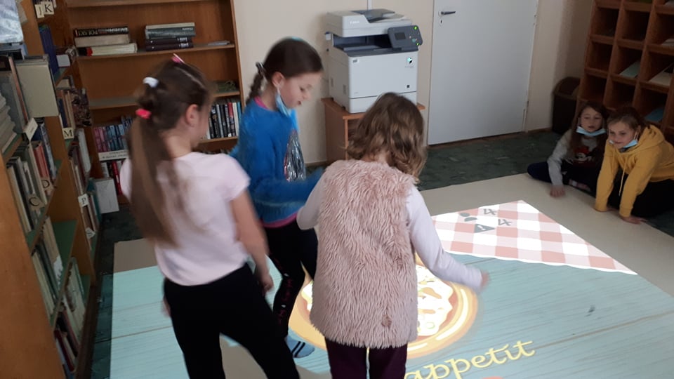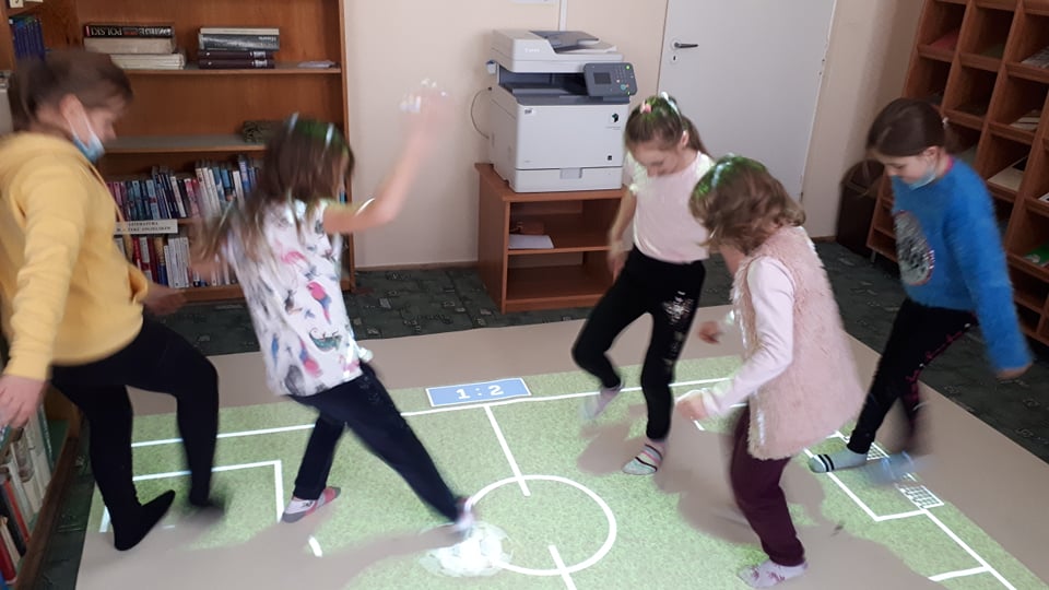 Druga część zajęć odbyła się z wykorzystaniem interaktywnej pomocy dydaktycznej „Magiczny Dywan”. Biorąc udział w grach „Rybki”, „Piłka nożna”, czy „Kolorowe pianino” dzieci świetnie ze sobą współpracowały. Uczniowie nie tylko ćwiczyli motorykę dużą, orientację przestrzenną i koordynację wzrokowo – ruchową, ale przede wszystkim wspaniale się bawili.
