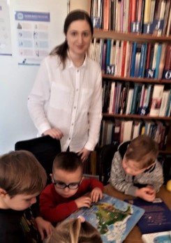 W pierwszej części zajęć uczniowie wysłuchali fragmentu książki pt. Wielka księga supermocy, z którego dowiedzieli się dlaczego książki są tak ważne i jak atrakcyjne może być ich czytanie. Najmłodsi chętnie odpowiadali na pytania i odgadywali zagadki dotyczące biblioteki. Przedszkolaki miały okazję zapoznać się z książeczkami skierowanymi do ich grupy wiekowej. Chętnie oglądały bogato ilustrowane pozycje, zarówno te w języku polskim, jak i te w języku angielskim i ukraińskim (pozyskane nieodpłatnie od Fundacji Powszechnego Czytania, w ramach akcji #KsiążkaChroni). W niezwykłą podróż wybrały się maluchy z mówiącym piórem Albik i różnotematycznymi książeczkami, jak „Świat zwierząt”, „Wrzechświat”, …