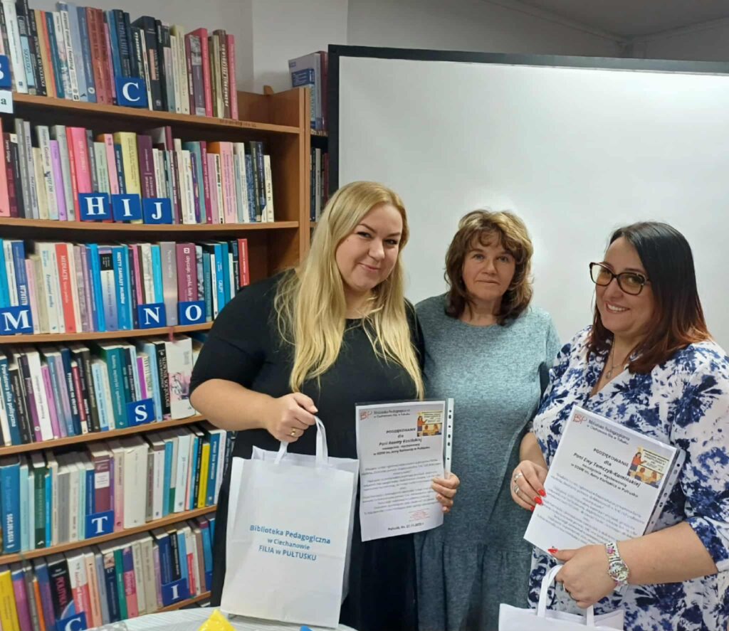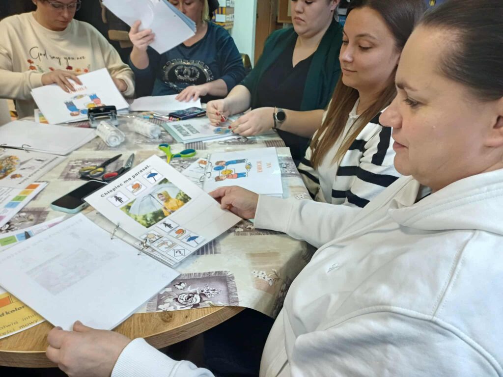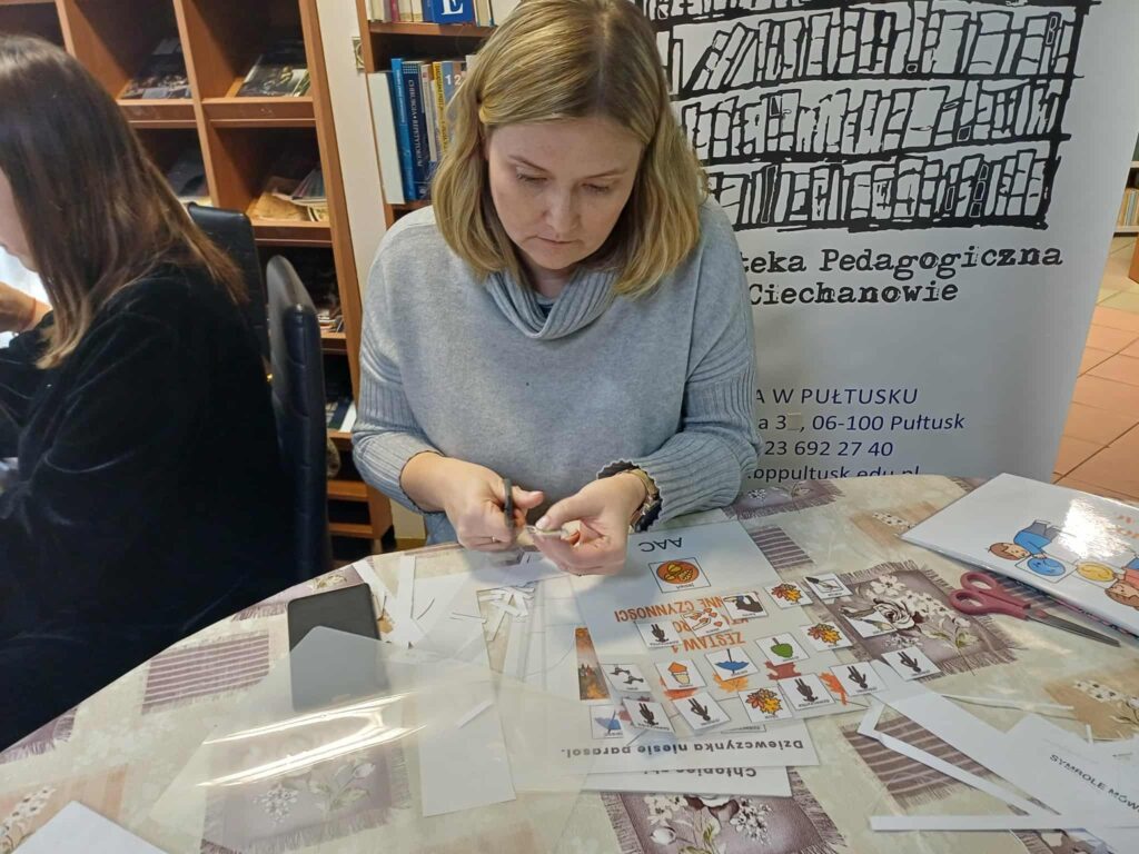 W części warsztatowej uczestnicy pracowali nad własnymi pomocami, tworząc książeczki komunikacyjne, tablice tematyczne oraz proste zestawy do modelowania języka. Prowadzące Panie: Ewa Tomczyk – Kamińska i Renta Kasińska nauczyciele-wychowawcy z SOSW im. Anny Karłowicz w Pułtusku omówiły najważniejsze elementy ich konstrukcji, m.in. sposób organizacji stron, dobór kluczowych słów i praktyczne metody mocowania symboli. Uczestnicy mieli możliwość testowania różnych rozwiązań, wymiany doświadczeń oraz konsultacji dotyczących indywidualnych potrzeb użytkowników AAC.